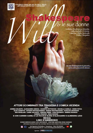 Ami il teatro? Vuoi assistere a uno spettacolo divertente e allo stesso tempo intenso e coinvolgente? Per divertirsi, non basta ridere, occorre coinvolgersi emotivamente. Il nostro spettacolo, attraverso le vicende di un gruppo scombinato di attori, alle prese con la scelta del testo da rappresentare, vi accompagnerà tra le vibranti emozioni di alcune delle più belle storie shakespeariane in cui emergono le figure femminili di Giulietta, Desdemona, Miranda, Lady Macbeth, Ermione, Caterina, Ofelia, Gertrude, Emilia, Cleopatra. Questa estate il vero divertimento si chiama Will Shakespeare & le sue donne.