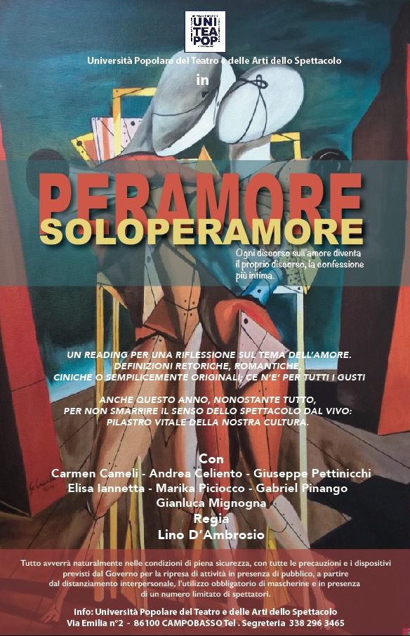 Non c’è niente di meglio per staccare la spina di una buona serata passata in compagnia dei propri amici. Prendere insieme un aperitivo e magari, prolungare la serata con uno spettacolo teatrale o un recital come quello che proponiamo quest’anno, incentrato sul tema dell’amore. A nostro parere è un modo per riflettere, ma anche per rilassarsi, chiacchierare e trascorrere un po’ di tempo all’aria aperta specialmente dopo le esperienze difficili dei mesi scorsi, costretti in casa e agli incontri virtuali, attraverso gli schermi dei nostri smartphone. Il teatro è l'antidoto al mondo virtuale: deve essere protetto anche per questo!